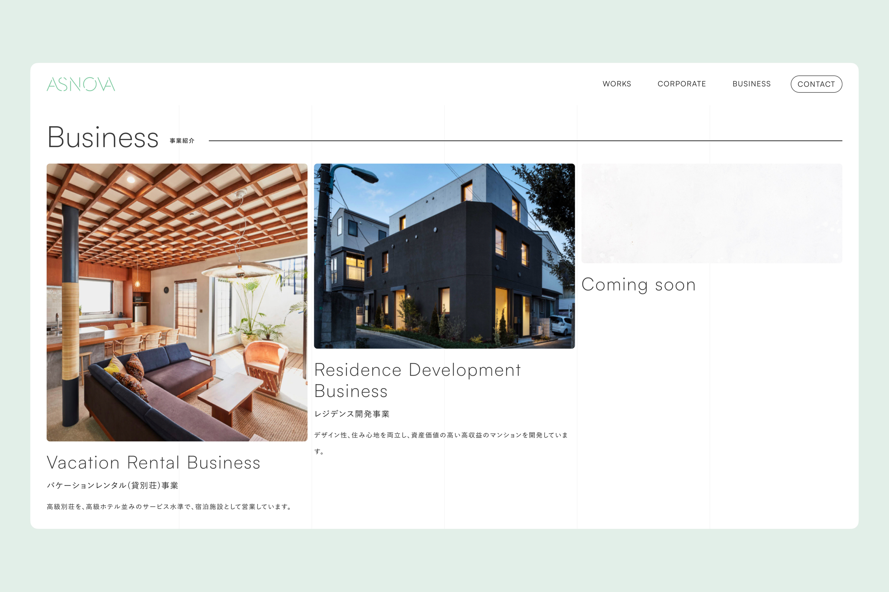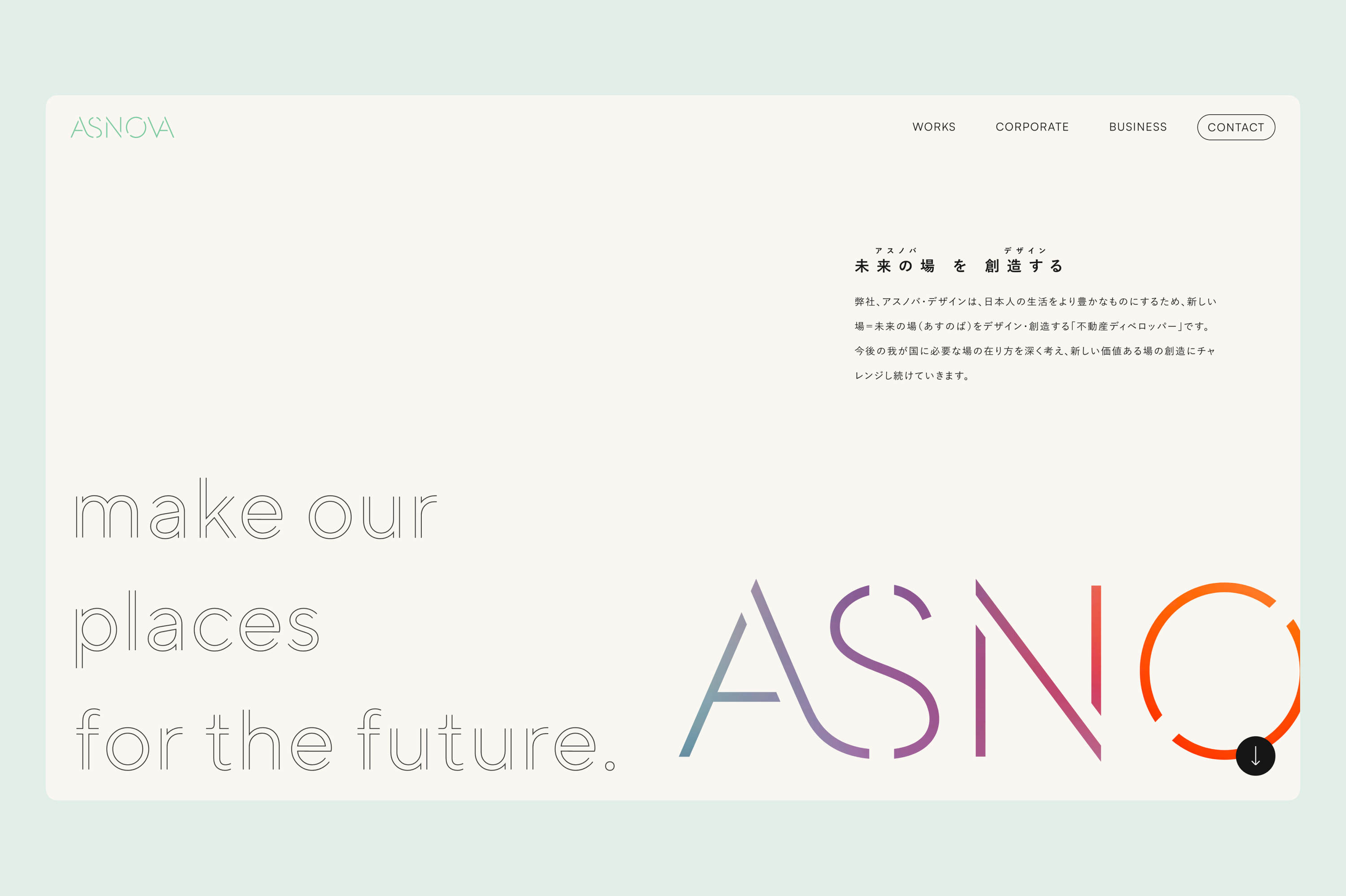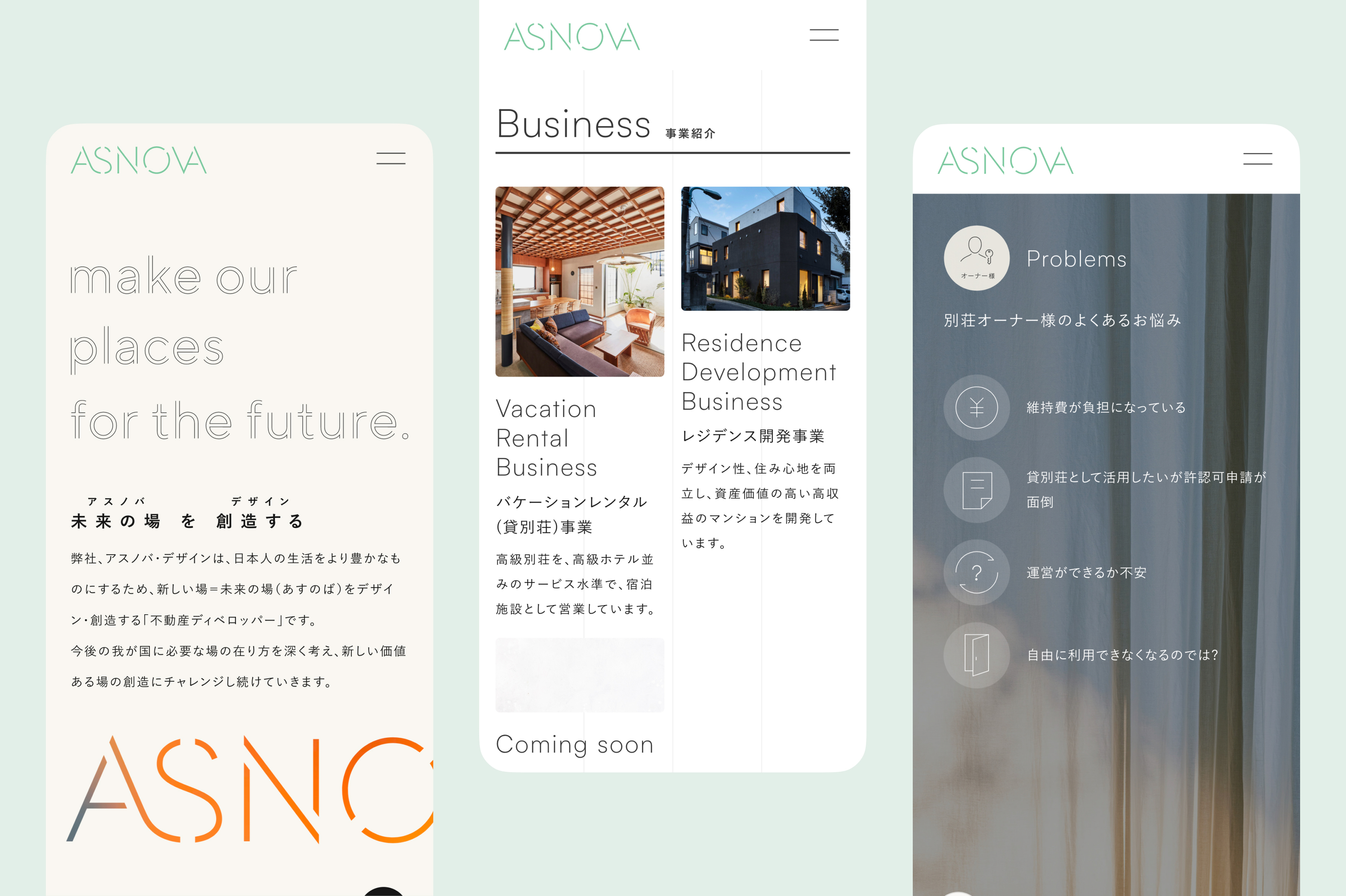 不動産事業を通じて、新しい不動産の形をデザイン・創造することを目指す株式会社アスノバ・デザインのコーポレートサイトを制作しました。