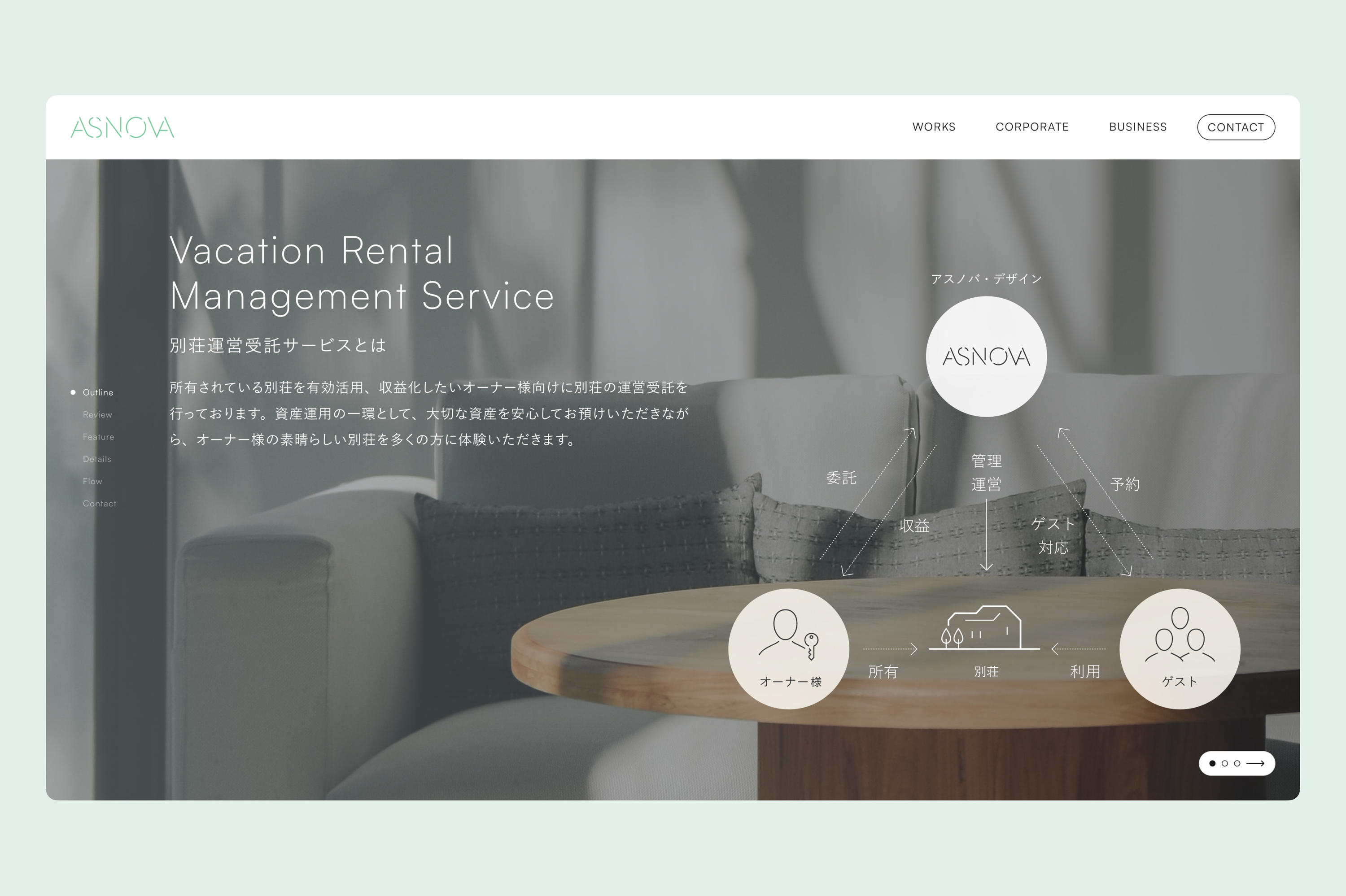 別荘運営委託サービスは概要がわかりやすく伝わるよう、アニメーションを用いて実装しています。