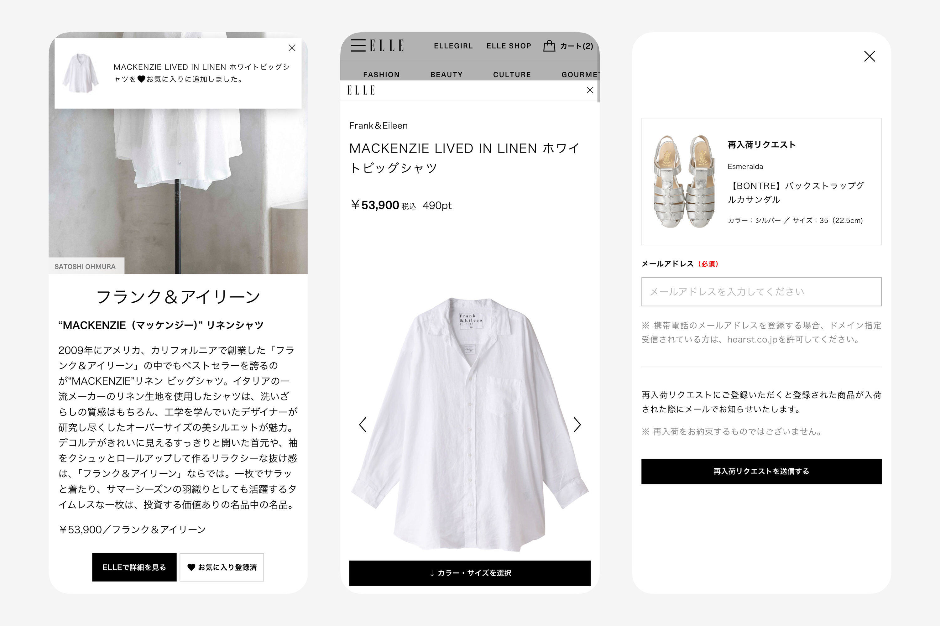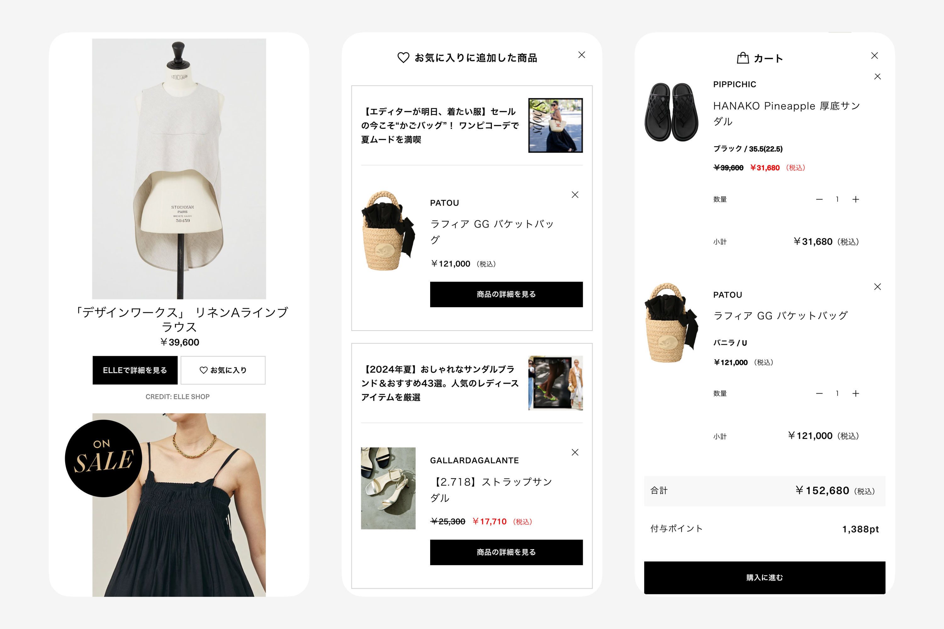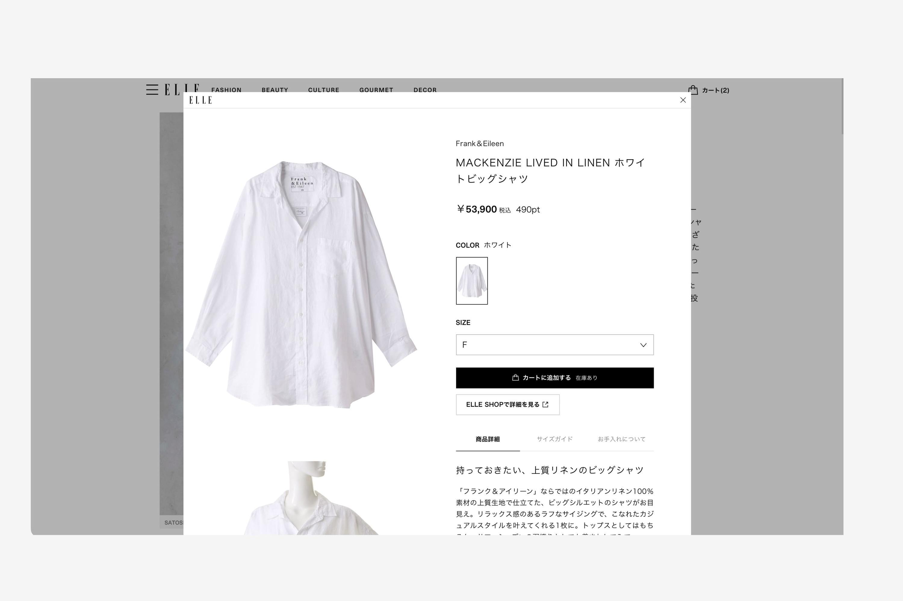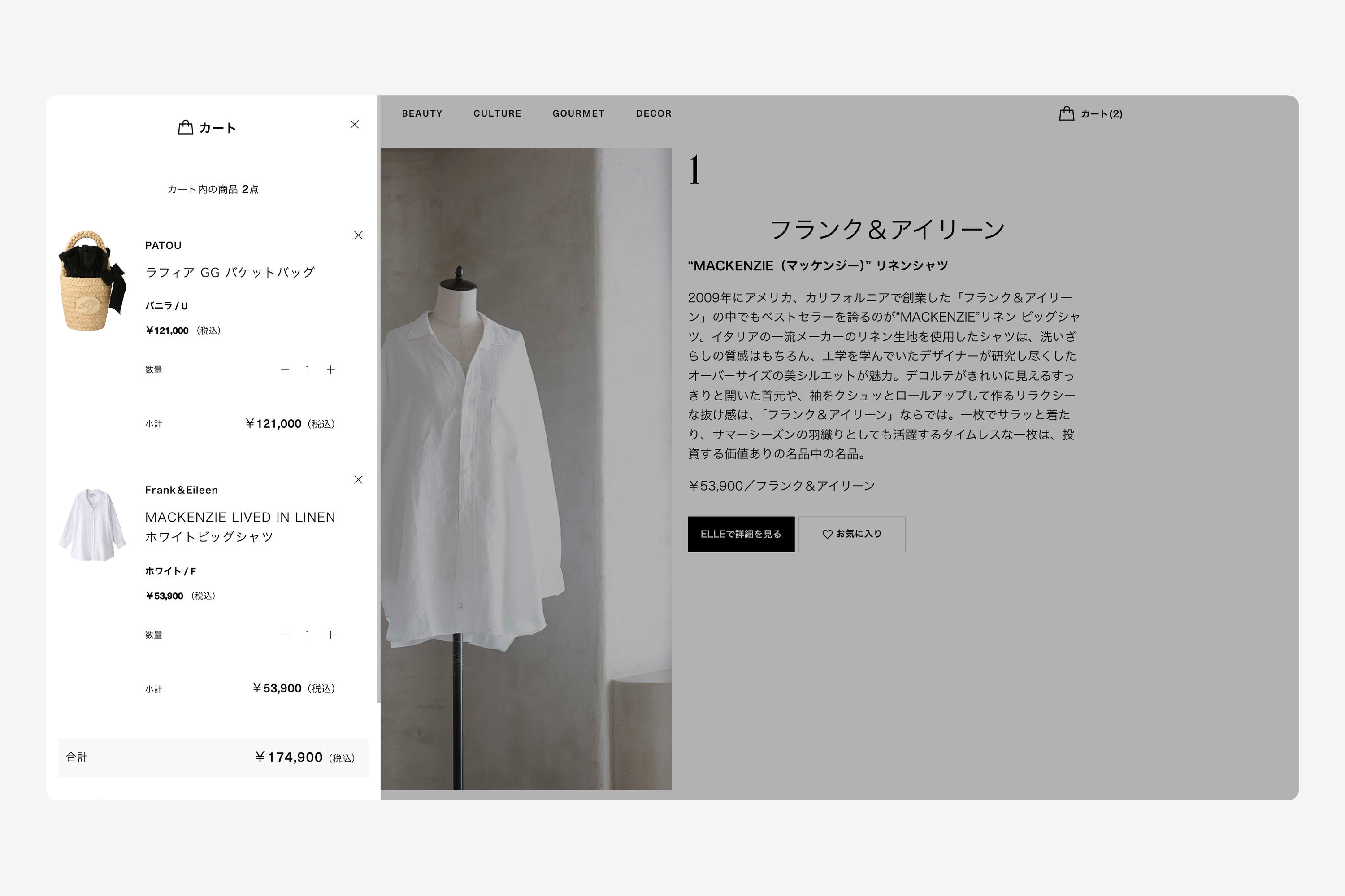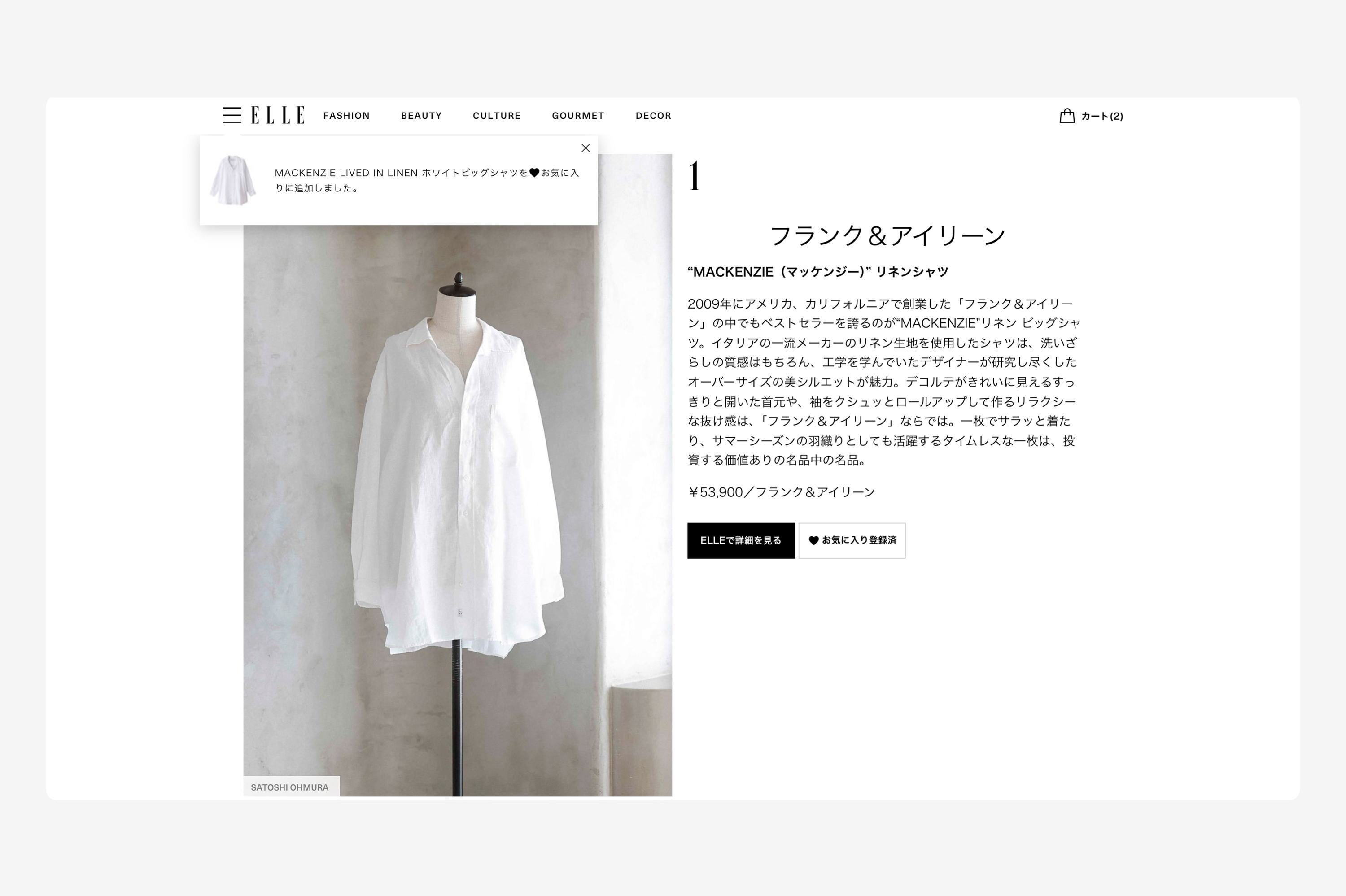 ハースト婦人画報社が運営するデジタルメディア「ELLE(エル デジタル)」のカート・決済機能「Embedded Commerce」のUX設計・デザイン・開発を行いました。ELLEの公式通販「ELLE SHOP(エル・ショップ)」の取り扱い商品をELLEサイト内で購入できる機能で、商品の紹介から購入までワンストップで行えることが特徴です。ユーザーの一番のサイト訪問目的は記事の閲覧となるため、メディアサイトとしての心地よさを損なわず、いかに自然な流れで「興味・関心」「情報収集」「意思決定」「購入」へと態度変容させられるかを意識したUX設計をしております。