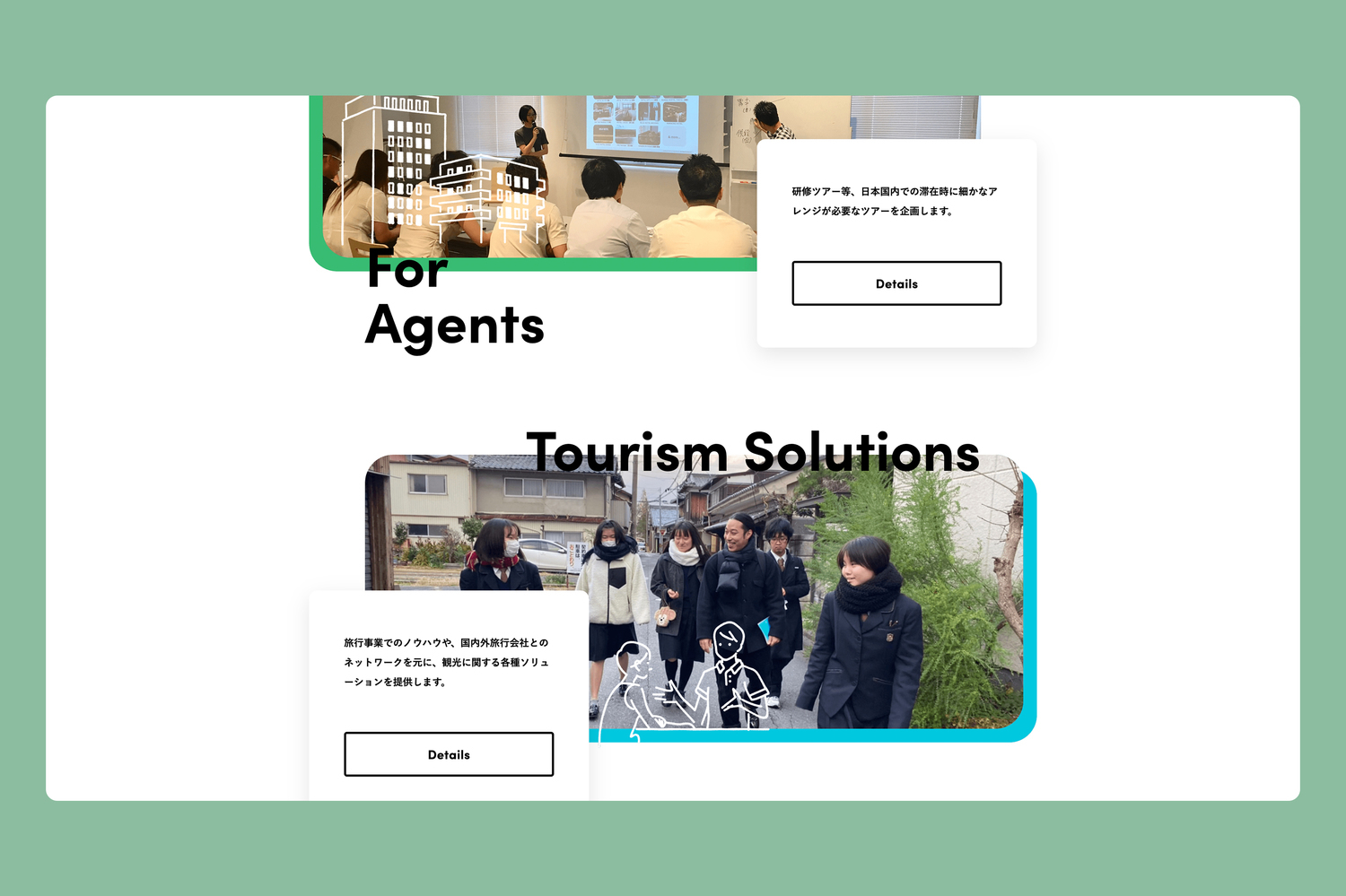 同社は「世界中のインバウンド旅行者から地域のファンを増やそう」という想いで事業を展開しています。コーポレートサイトでは、多岐にわたる事業内容を整理して紹介しています。