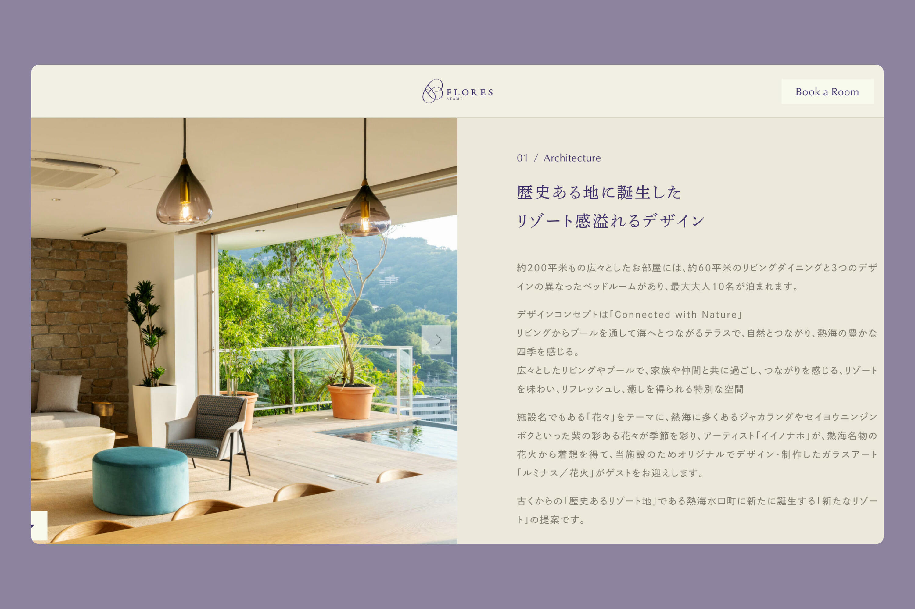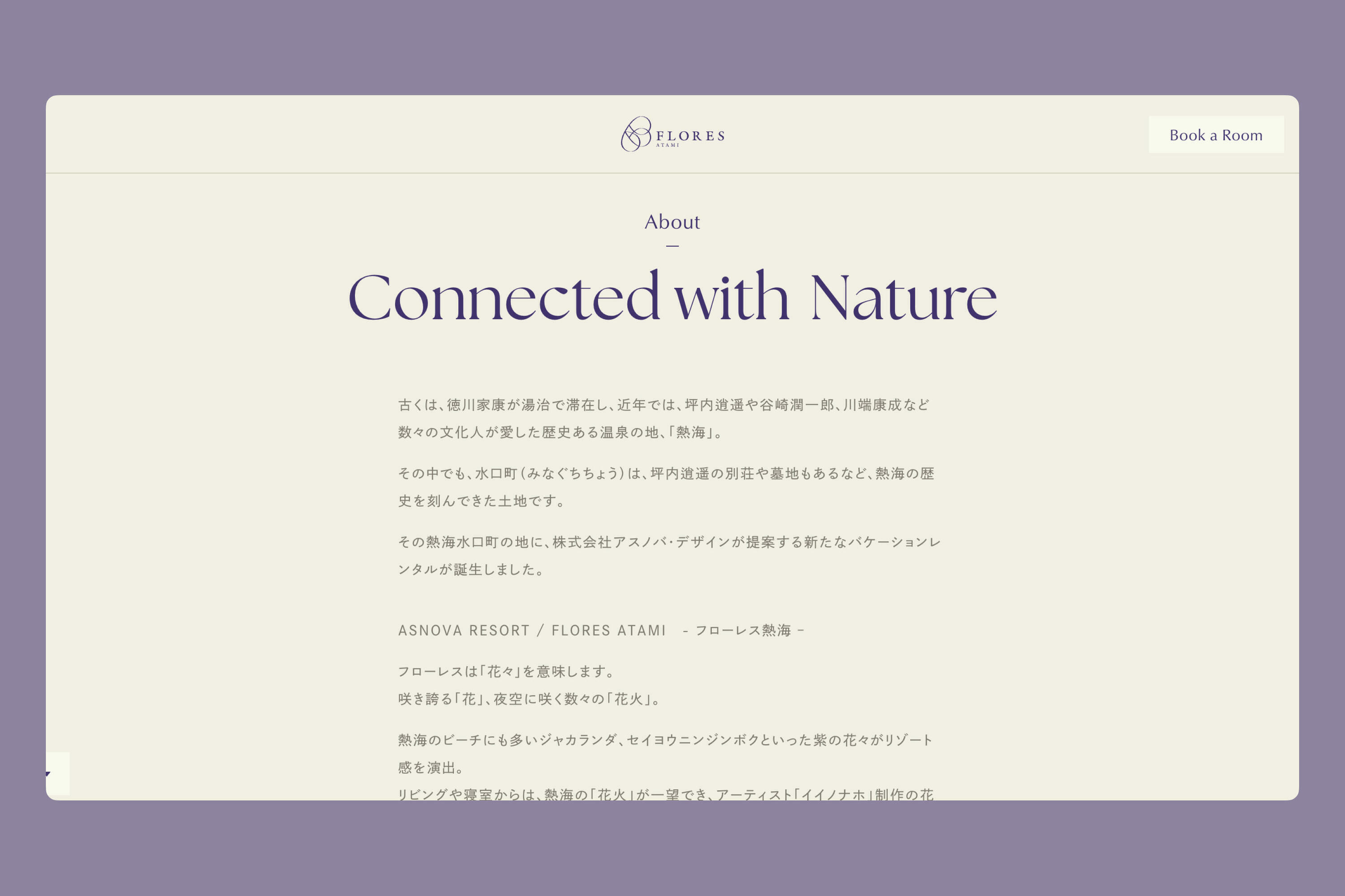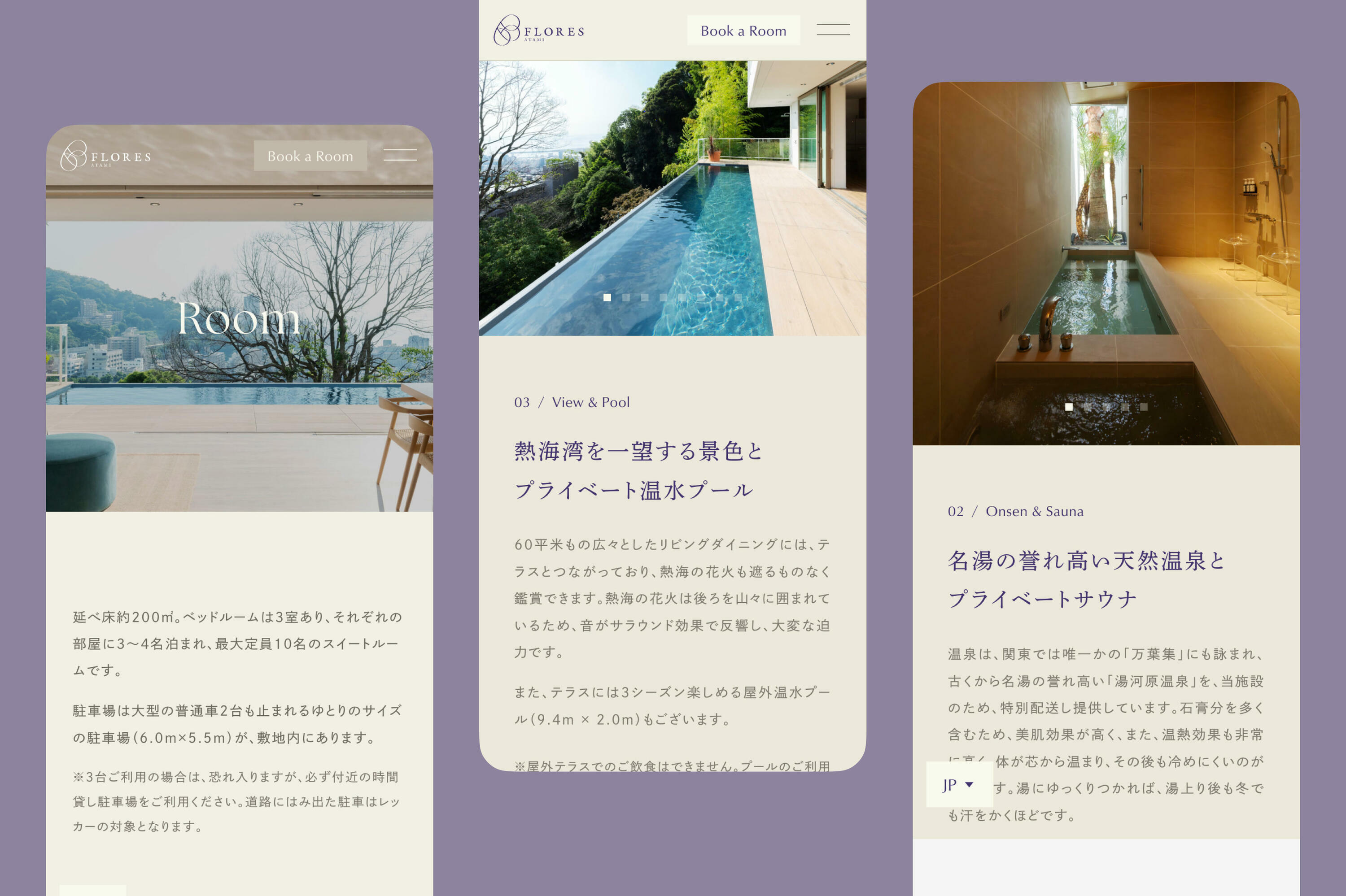 熱海・水口町に開業したバケーションレンタル(貸別荘)「ASNOVA RESORT/FLORES ATAMI(フローレス熱海)」の Web サイト制作を担当しました。