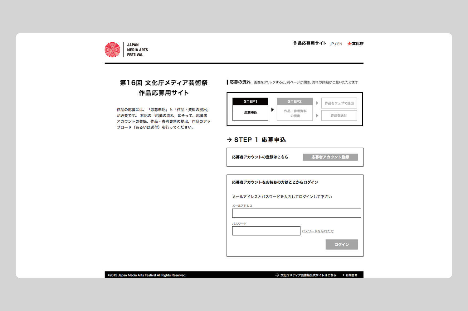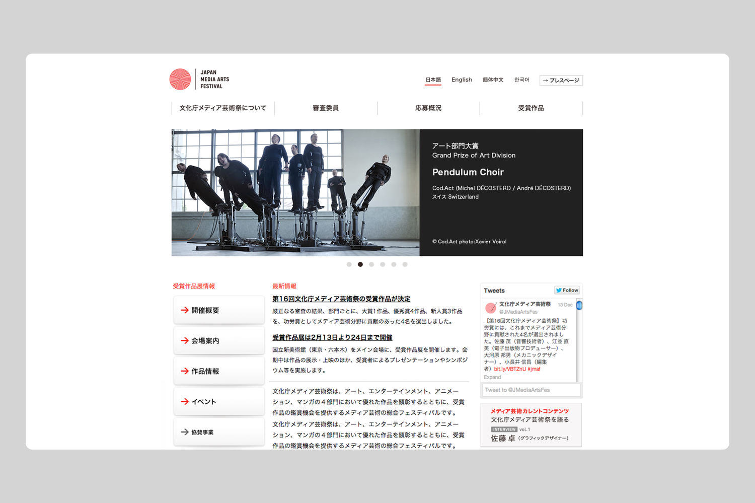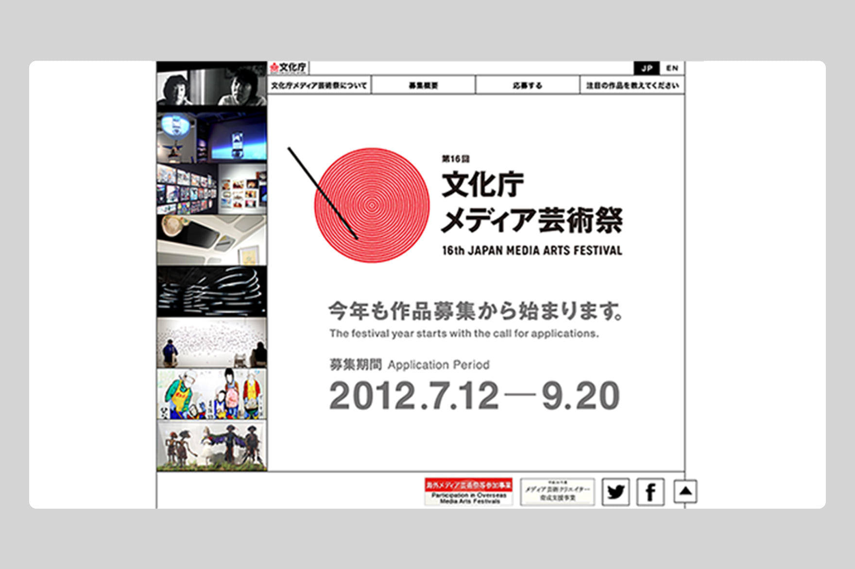 第16回文化庁メディア芸術祭の応募システムの企画・開発・運用および、展示会特設サイトの実装・運用を担当しました。