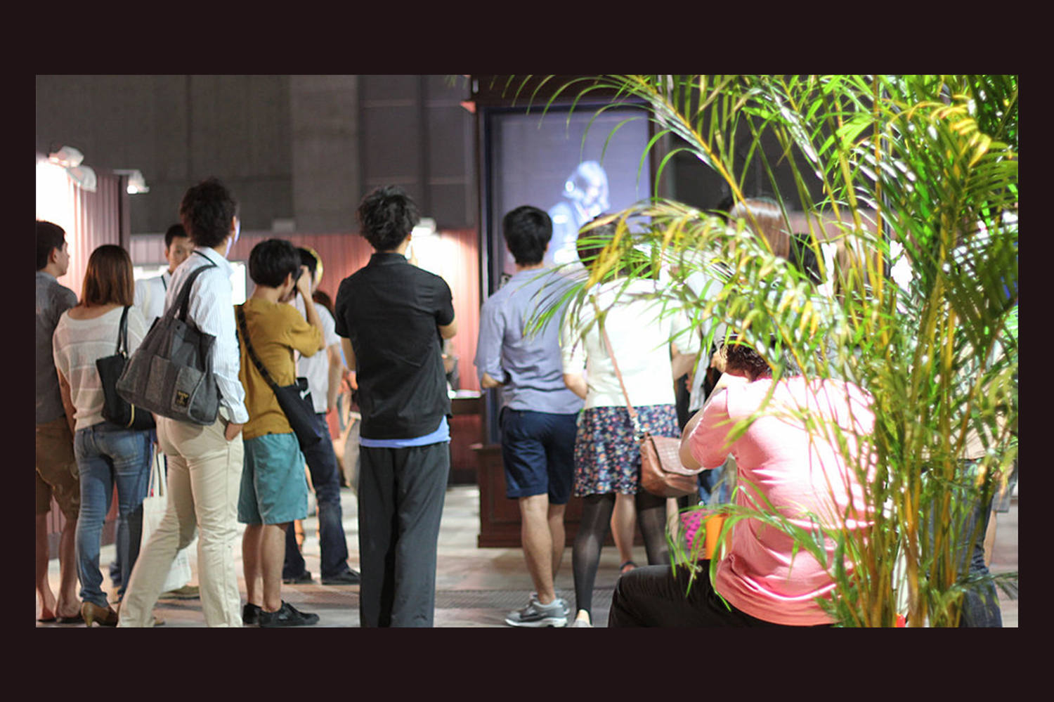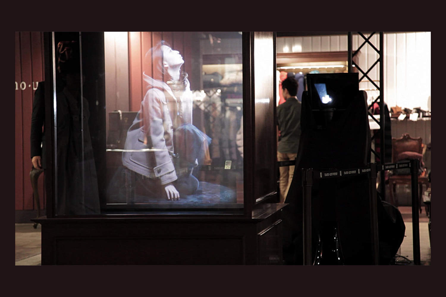 透過スクリーンに映像を投影する事で、モデルが空間に突然現れたような存在感を演出し、多くの来場者の目を引く仕掛けとなっています。
