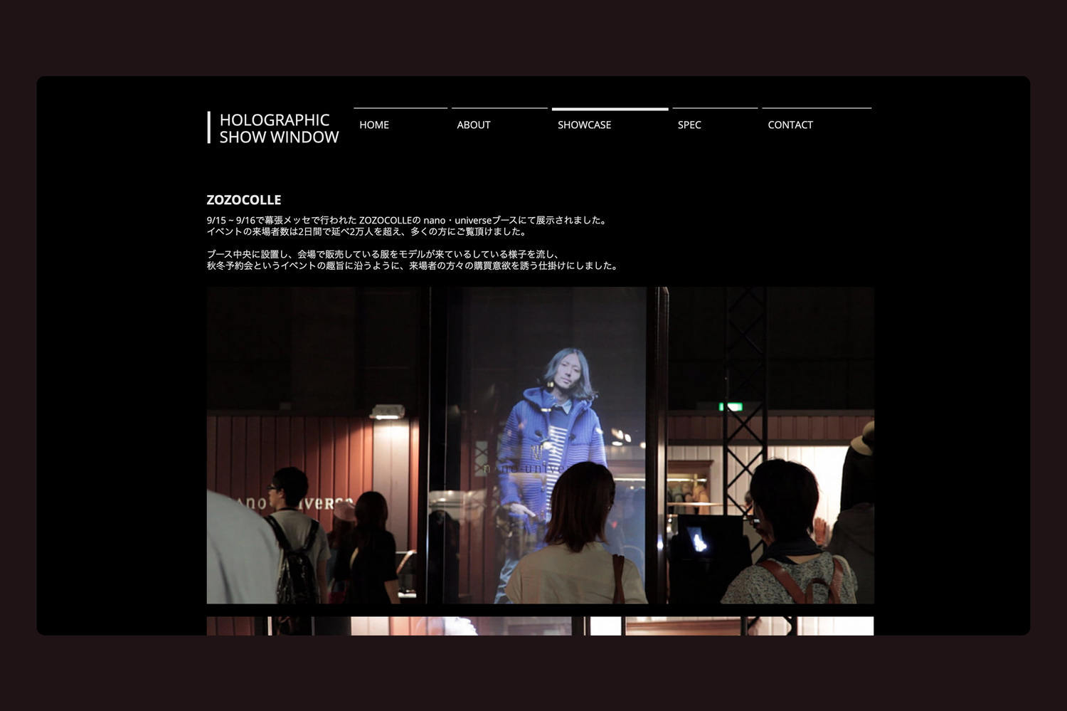 2012年9月15-16日に幕張メッセで行われたZOZOCOLLEのnano・universeブースにて展示された Holographic Show Window のプロデュースを担当しました。