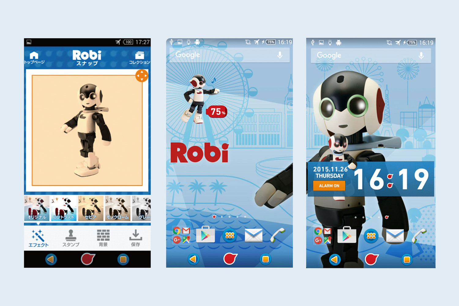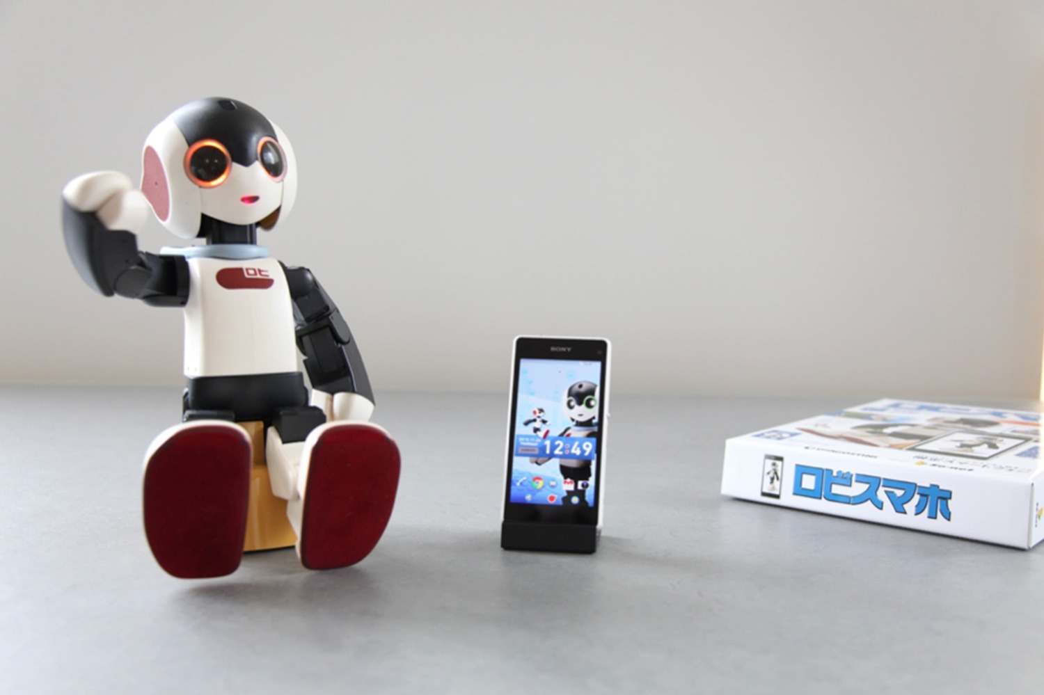 「ロビスマホ」は、ソニーの “ Xperia j1 compact ” にロビスマホ専用のアプリやテーマがインストールされたスマートフォンで、専用の外装ボックスで届けられ、ロビの世界観を表現した可愛らしいロビスマホ専用のシートも同梱されています。