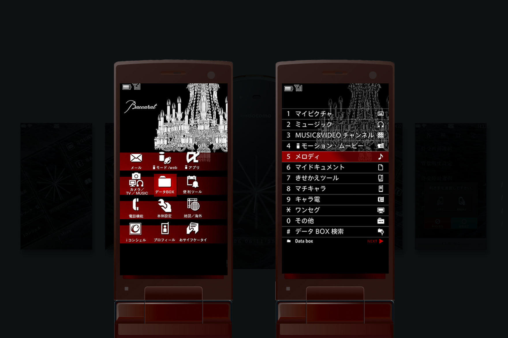 バカラレッドと呼ばれているカラーを基調にシャンデリアやグラスが美しく見えて、携帯電話のメニューとして成り立つようなレイアウトを探して何度も調整を繰り返し作り上げました。携帯の小さい画面で繊細さや高級感を出すためにシャンデリアを線画でおこしたり、写真のレタッチに非常に気を使った苦労があります。