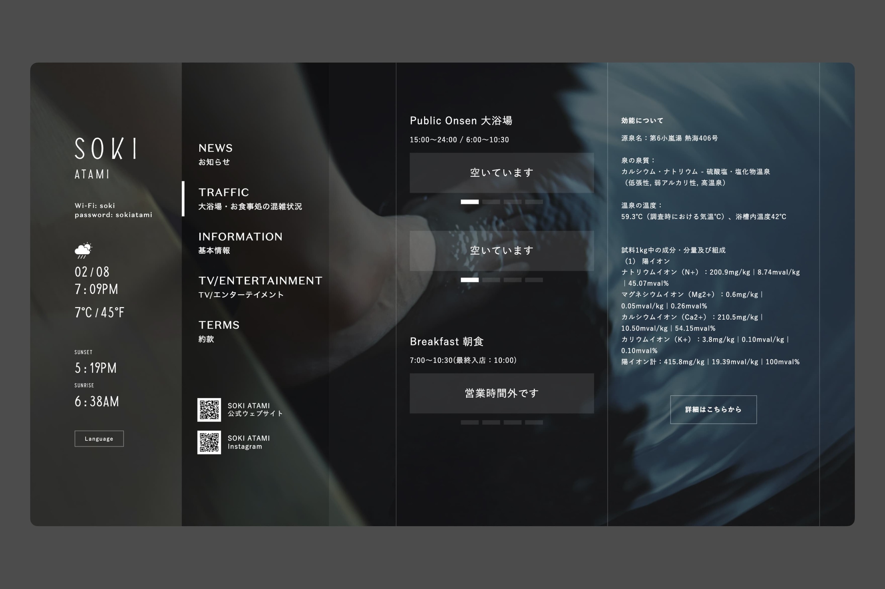 「SOKI ATAMI」では客室のスマートTVの情報設計、デザイン、開発、「SOKI KANAZAWA」ではスマートフォンでアクセスできる館内案内サイトの情報設計、開発もあわせて担当しました。