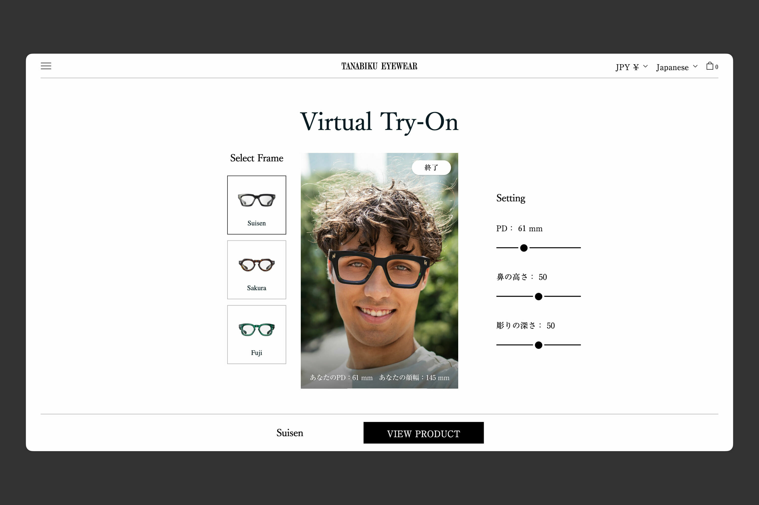 海外展開を見据え、越境ECとして構築。さらに、店頭で試着できないユーザーのために、3DモデリングによるARフィッティング機能や、カメラを使って瞳孔間距離(PD)を自動測定できる仕組みも導入し、オンラインでもリアルな装着感を実現しました。