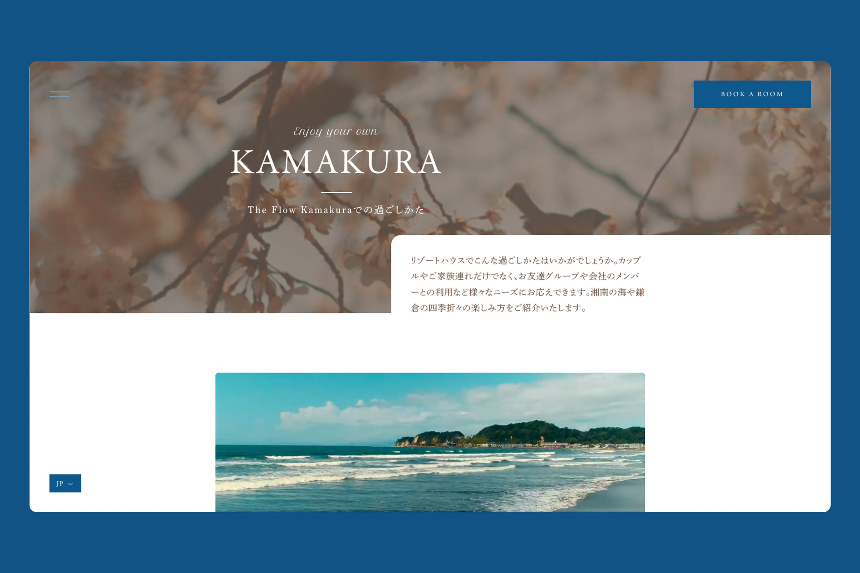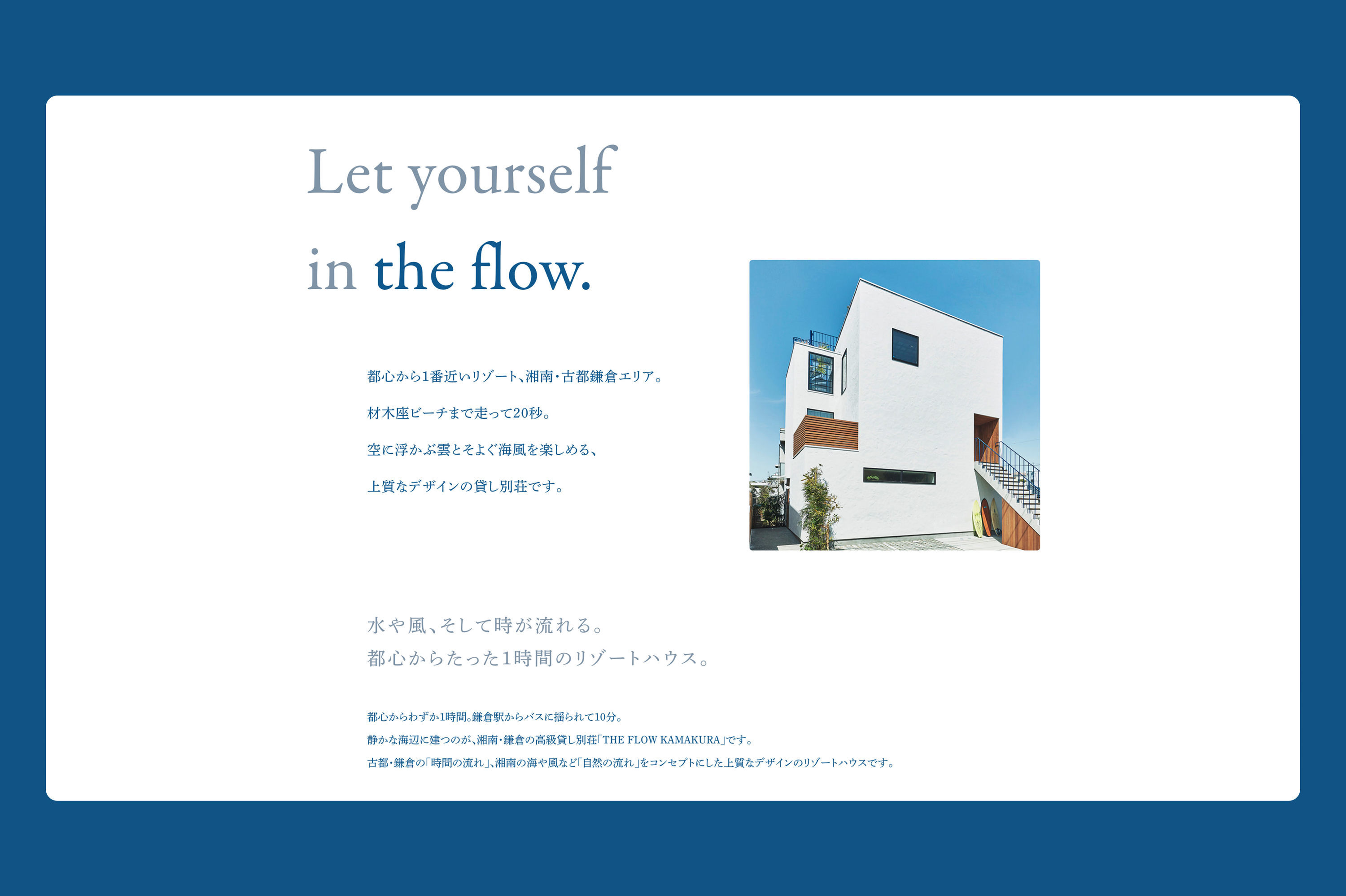 湘南・鎌倉の高級貸し別荘「THE FLOW KAMAKURA」のディレクション、デザイン、ムービーディレクション、開発を担当しました。