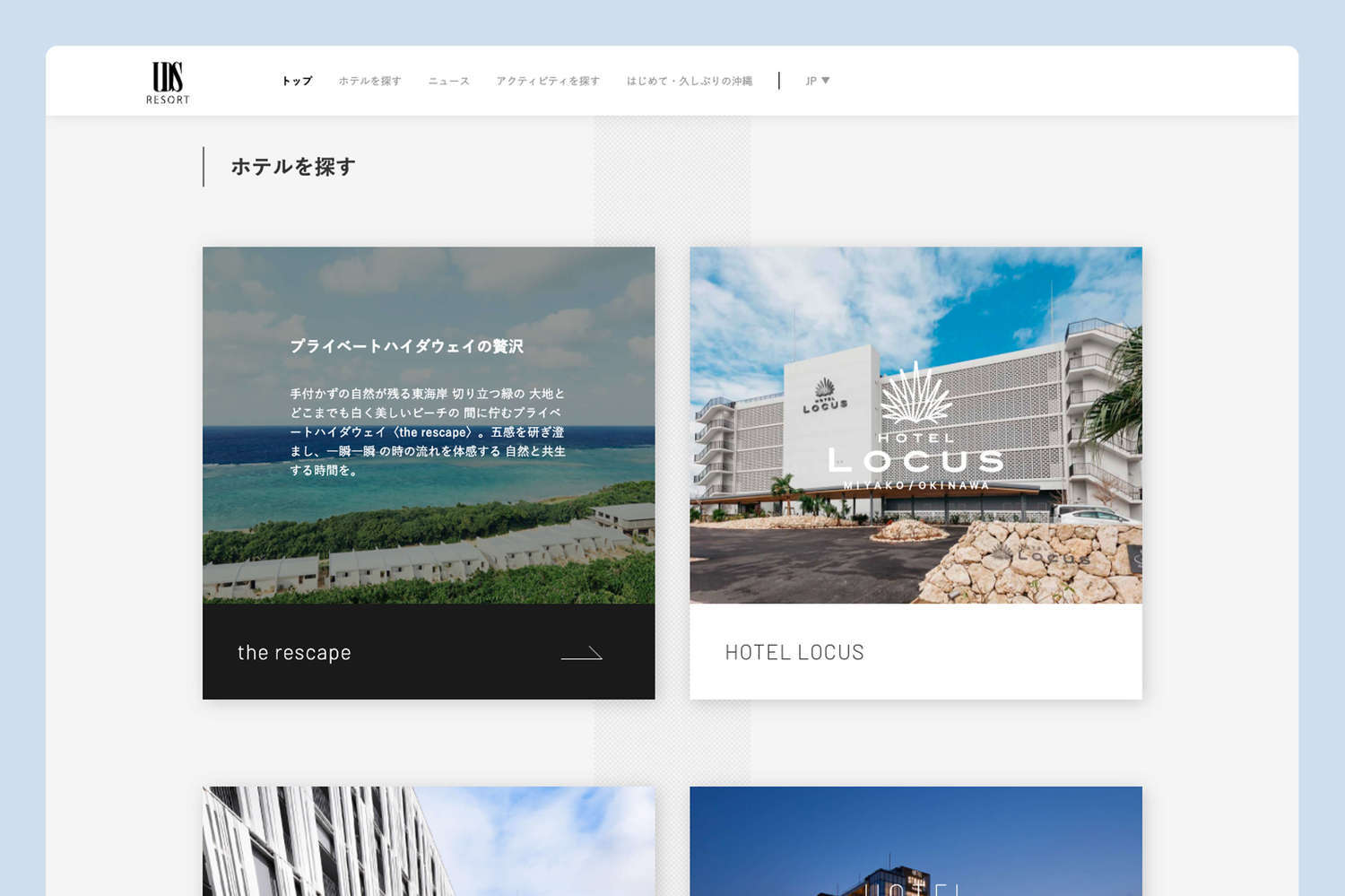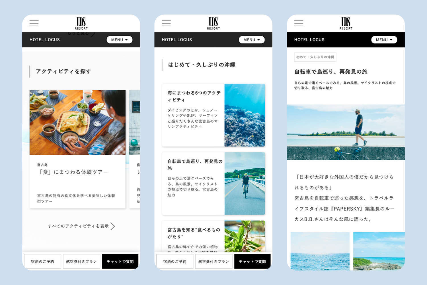 ユーザーが自分の旅行スタイルや予算、滞在中のアクティビティに合わせてホテルを選択できたり、離島も含めた沖縄地域全体の多様性を感じてもらう点を意識して情報設計しました。